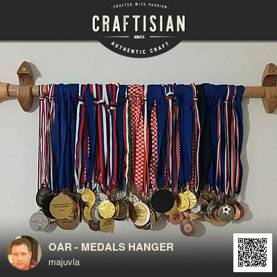 For a member of the rowing club, I made a medal hanger in the shape of an oar. The handle is made of a beech bar measuring 80cm/35mm. Before shaping the oar from glued pine profiles 35x16x4.5 cm, I drilled 35 mm holes for the handle. I shaped the oars on a band saw with a lot of sanding. The inscriptions were written with a pyrograph. I made the oar holders from oak, in such a way that one side can be easily lifted and the medals inserted. Everything is varnished with matte varnish.