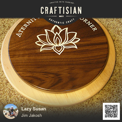 This is a project for a fellow crafter from the craft show last week. She wanted her logo and a lotus flower on the top of a lazy Susan with walnut on the 12" top plate and maple on the bottom 14 1/2" one. This has a 6" bearing that is embedded half the thickness into the top plate. It is finished with clear satin lacquer.