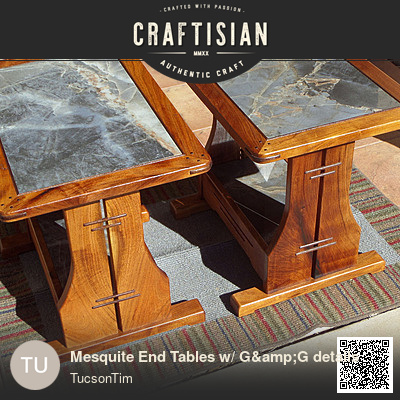Details - Mesquite with Porcelin tile. Black Walnut pegs, splines, and trim. Mortise and loose tenon jonery. The table measures 21 inches tall. The top is 17 by 25 inches. The Wifey picked out the large format tile (2 by 4 feet). I would have never picked it myself, but it turned out to be a good choice. Smart girl...