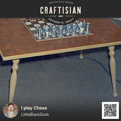 Chess table made in 1977. Bought legs, chipboard tabletop lined with vinyl, white and brown tiled chess board, with hardwood banding.