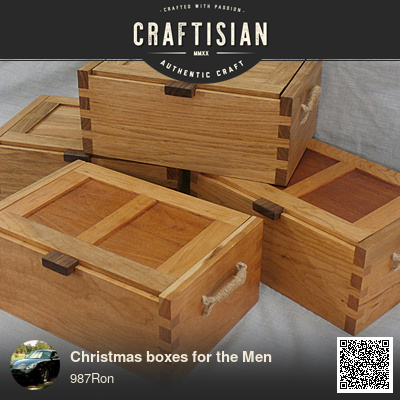 Have always made the girls a box at Christmas, never the guys, so this year a box for the Son, Grandson, Grandson-in-law. Extra one for me. Basic design came from Fine Woodworking Issue. 2 of the boxes are of Butternut with Walnut trays and lid lift. 2 are Cherry with Mahogany inserts in top and bottom, walnut trays and lid lifts. Brusso hinges, and self made jute handles.. Handles are wedged in 3/8" diameter holes in the sides of the boxes with a touch of titebond II.