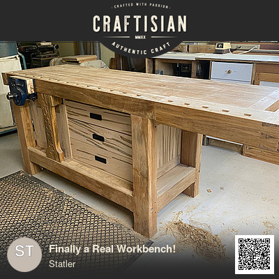 I carried around an old issue of FW with a workbench design for 45 years, promising myself to build it one day. In the meantime I used the 60 lb 2x6 bench in the picture (also from FW). My sawyer had several hundred BF of wormy maple that had been rained on and water stained, so I got it for the price of pine. So it was off to the races to make my heirloom bench, based on a more recent design by Chris Gochnour. The under bench cabinet was inspired by Christian Becksvoort. The end result is about 400 lb and it doesn't move much at all when I'm pushing a plane.