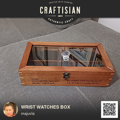 35x19x9cm mahogany box for placing 10 wrist watches, as birthday present , with laser engraved personalized text. Inner compartment were made of thermaly threated ash, with inserted 7.5x6x4cm small cushions. On top lid is 3mm glass. Finish non glossy spray laquer.