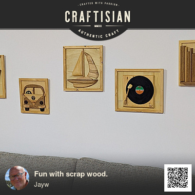 A few wooden wall decorations, made with scraps from the workshop. They represent some of my hobbies, past and present.