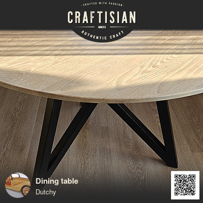 Made of European oak. The diameter of the tabletop is 116 cm, and it has a thickness of 36 mm. The two tables I bought at the recycling center were 6 cm thick and constructed from three layers. During processing, I discovered that they were unfortunately both hollow (the intermediate layer was only applied to the edge). That meant extra gluing work to make the new one. The legs are painted black and the tabletop has an Osmo finish. I found the Osmo layers used to be difficult to work with.