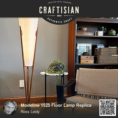 here. It's an approximation of the Modeline 1525 lamp that was in production in the 1950's and 1960's. Cherry frame, linen-over-pvc-sheet shade, LED strip lighting, with dimmable driver hidden in the base.